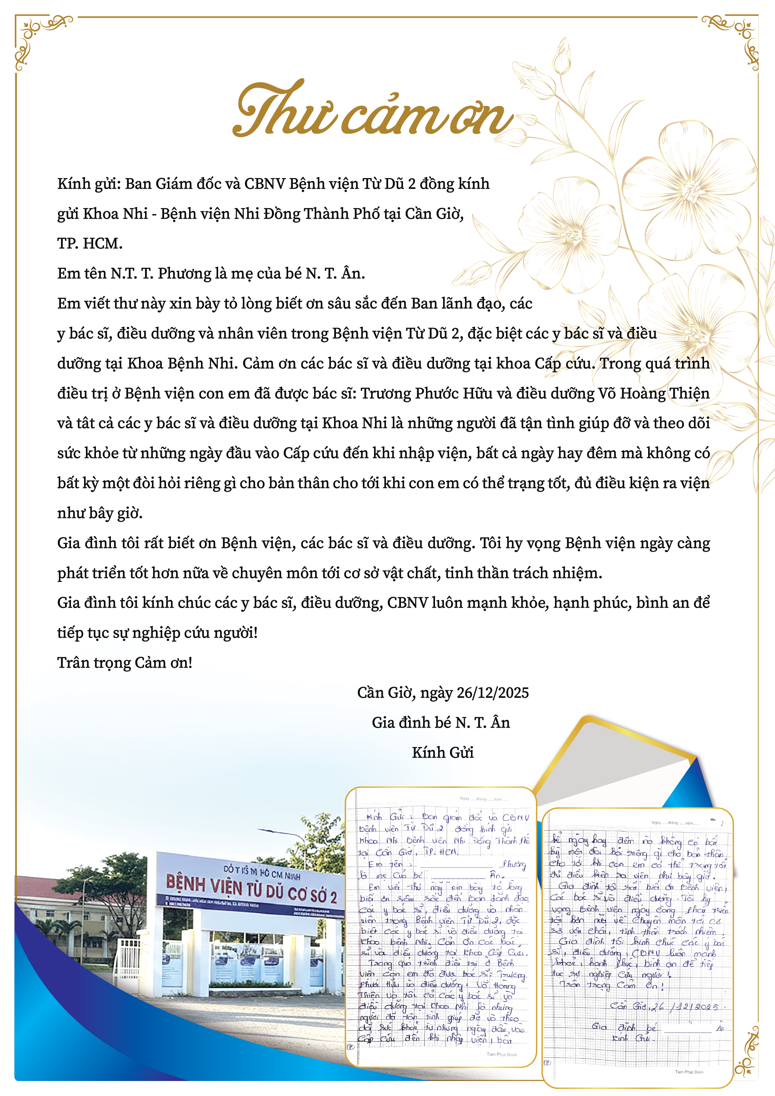 Em viết thư này xin bày tỏ lòng biết ơn sâu sắc đến Ban lãnh đạo, các y bác sĩ, điều dưỡngng và nhân viên trong Bệnh viện Từ Dũ 2, đặc biệt các y bác sĩ và điều dưỡng tại Khoa Bệnh Nhi. Cảm ơn các bác sĩ và điều dưỡng tại khoa Cấp cứu. Trong quá trình điều trị ở Bệnh viện con em đã được bác sĩ: Trương Phước Hữu và điều dưỡng Võ Hoàng Thiện và tât cả các y bác sĩ và điều dưỡng tại Khoa Nhi là những người đã tận tình giúp đỡ và theo dõi sức khỏe từ những ngày đầu vào Cấp cứu đến khi nhập viện, bất cả ngày hay đêm mà không có bất kỳ một đòi hỏi riêng gì cho bản thân cho tới khi con em có thể trạng tốt, đủ điều kiện ra viện như bây giờ.