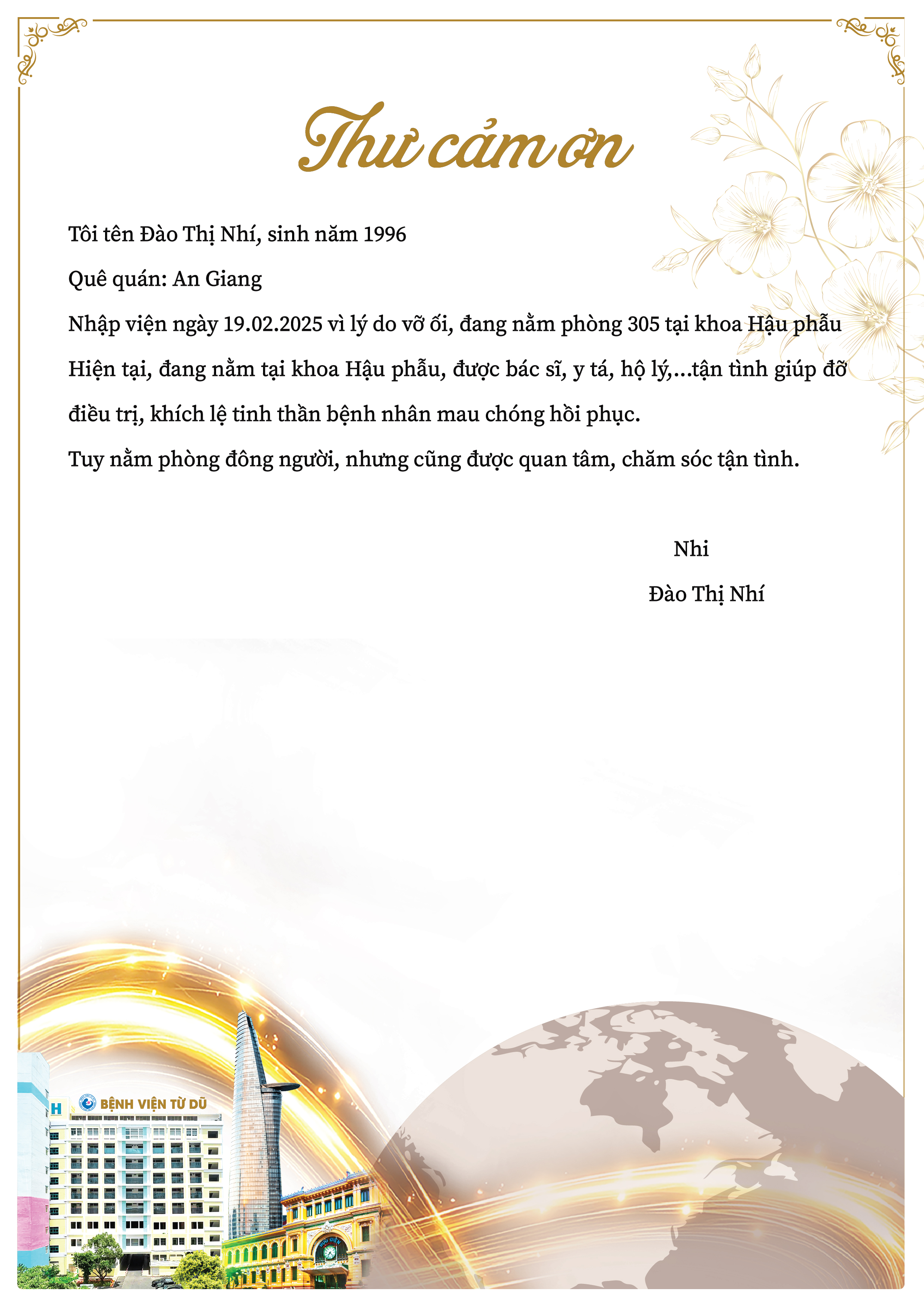 Tôi tên Trần Thị Tư, sinh năm 1954, hiện cư ngụ tại Quận Ninh Kiều, TP. Cần Thơ, là mẹ ruột của bệnh nhân Nguyễn Thị Phương Lan, sinh năm 1976. Chúng tôi xin gửi lời cảm ơn chân thành đến đội ngũ y bác sĩ Bệnh viện Từ Dũ, TP.HCM, nơi đã thực hiện thành công ca phẫu thuật quan trọng cho con gái tôi vào ngày 26-9-2024.