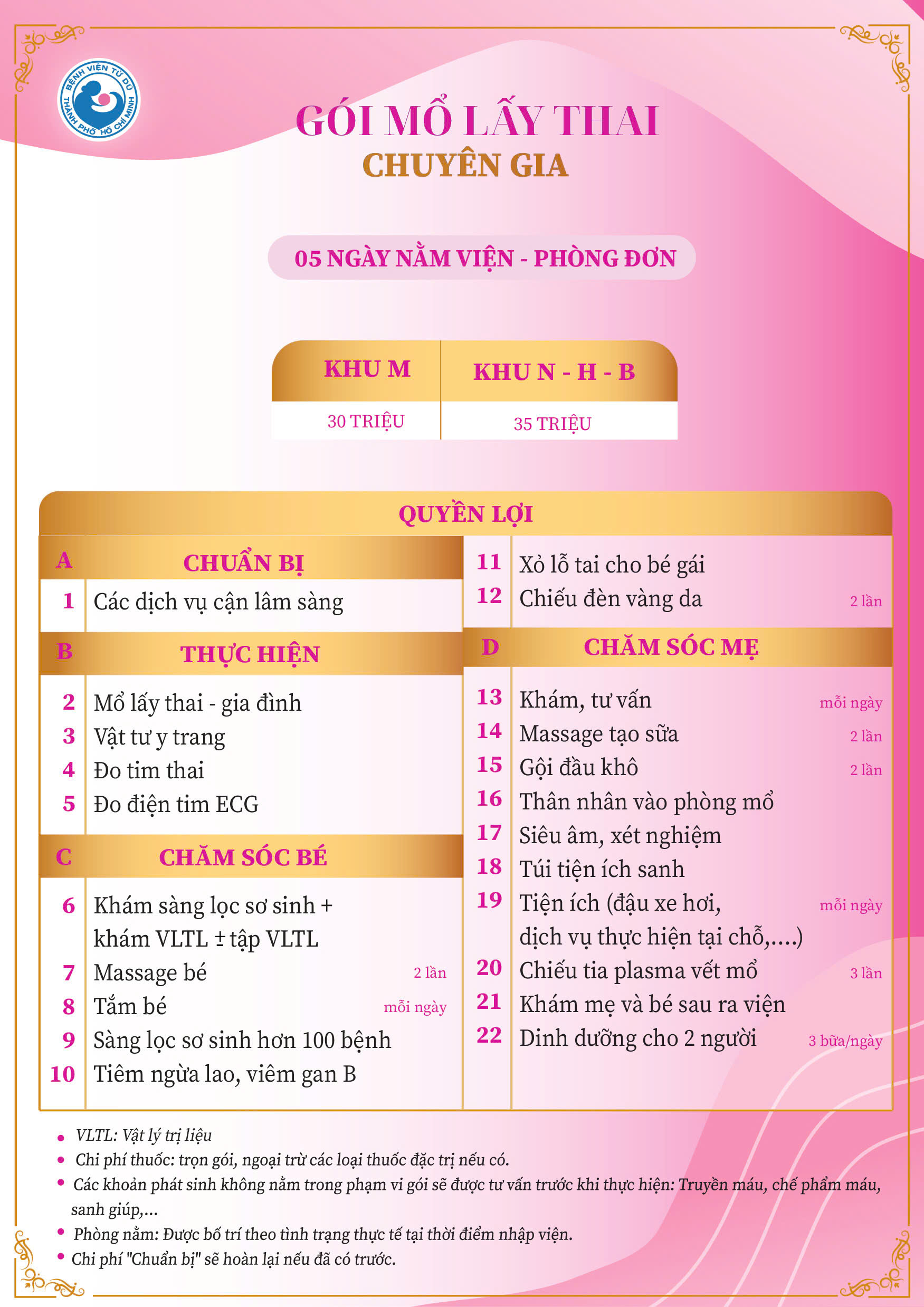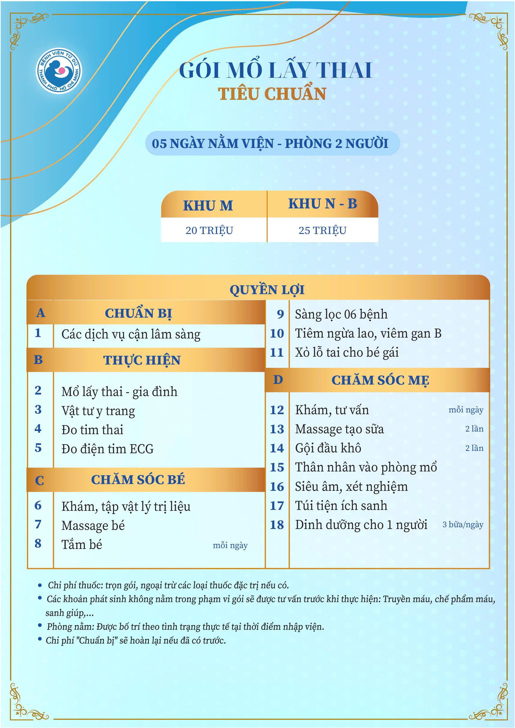 - Gói mổ lấy thai tiêu chuẩn & gói chuyên gia áp dụng cho các dịch vụ có trong gói và tối đa đến ngày hậu phẫu thứ 5 Sản phụ nhập viện mổ chủ động từ 0g00 – 20g00: tính là ngày hậu phẫu thứ 1 Sản phụ nhập viện mổ chủ động từ 20g01 – 23g59: qua 0g00 ngày hôm sau bắt đầu tính là ngày hậu phẫu thứ 1 + Các chi phí phát sinh ngoài gói và chi phí nằm viện sau ngày hậu phẫu thứ 5. + Chi phí điều trị các bệnh lý phát sinh của mẹ và bé + Người nuôi bệnh thứ 2 trở đi. |