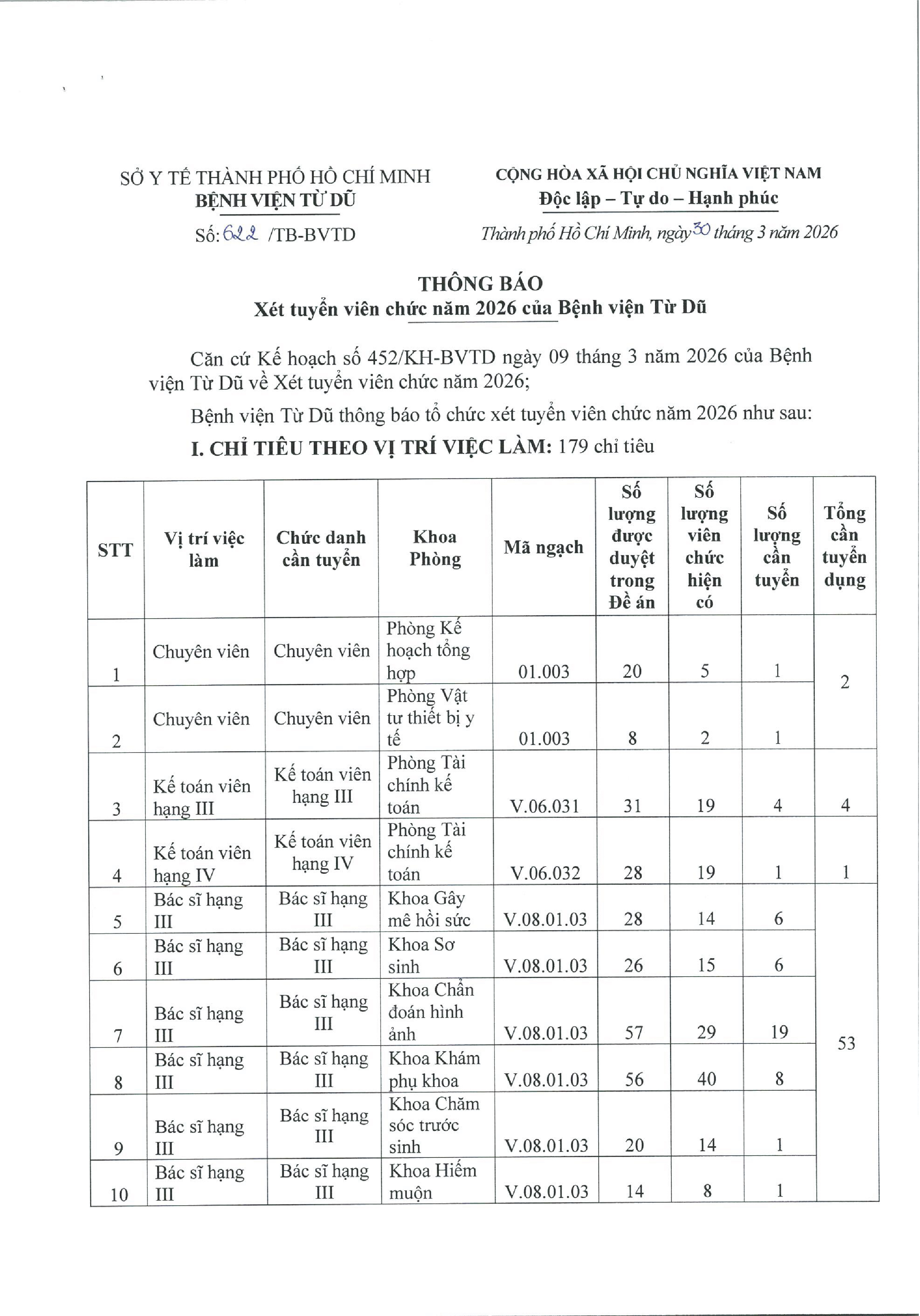 Căn cứ Kế hoạch số 452/KH-BVTD ngày 09 tháng 3 năm 2026 của Bệnh viện Từ Dũ về Xét tuyển viên chức năm 2026.