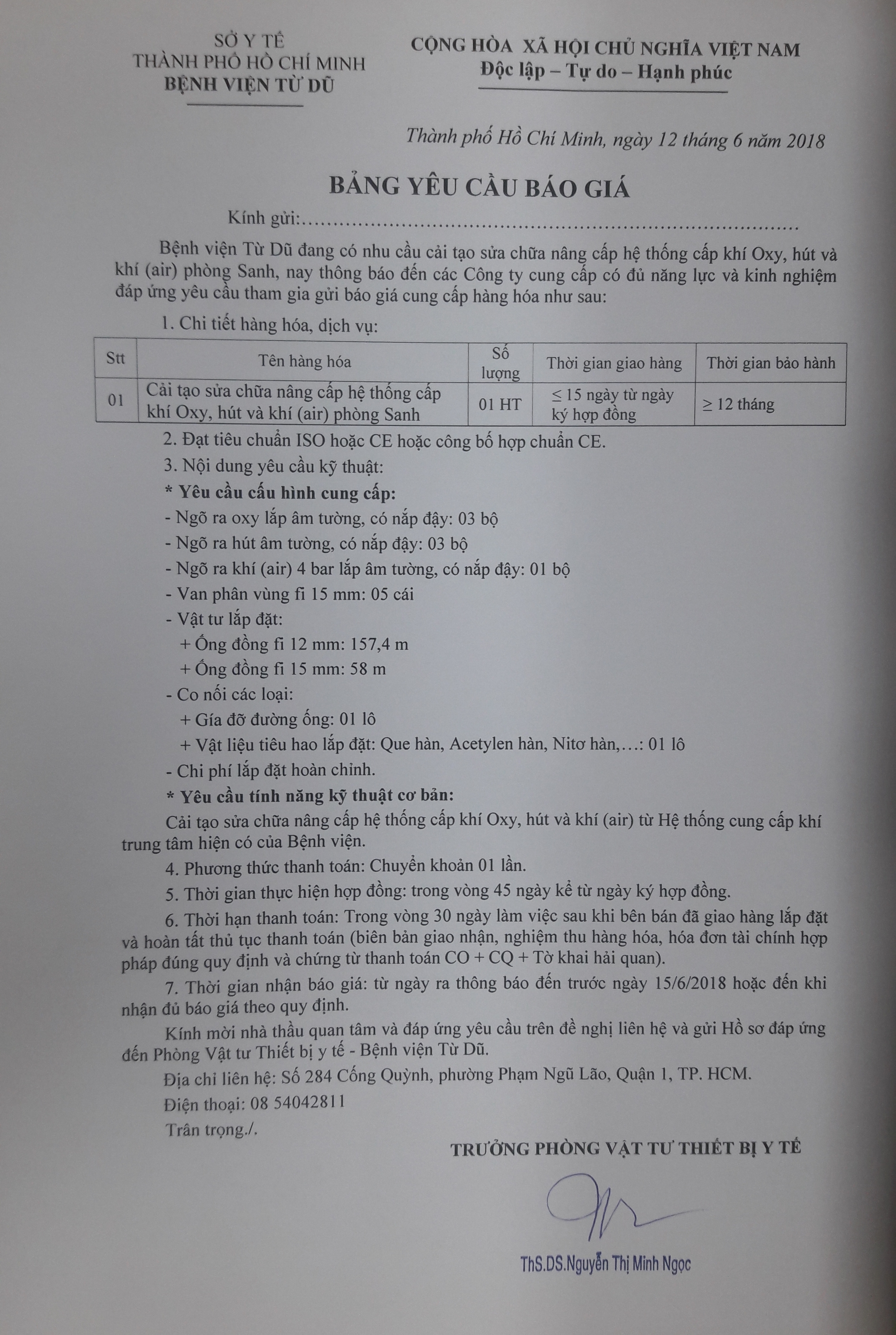 Bệnh viện Từ Dũ đang có nhu cầu cải tạo sửa chữa nâng cấp hệ thống cấp khí Oxy, hút và khí (air) phòng Sanh, nay thông báo đến các Công ty cung cấp có đủ năng lực và kinh nghiệm đáp ứng yêu cầu tham gia gửi báo giá cung cấp hàng hóa như sau:
