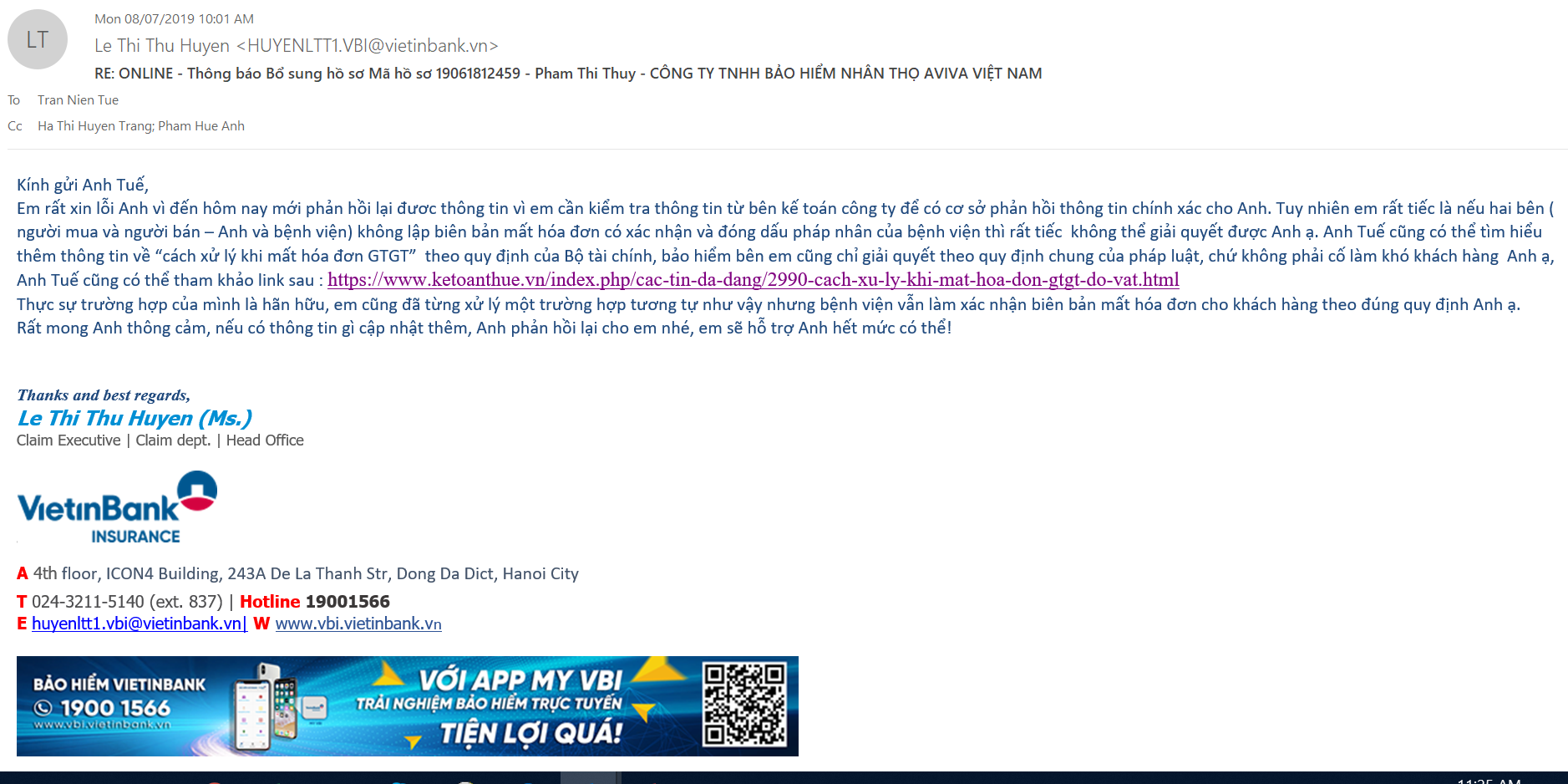 Kinh gởi anh chị bộ phận kế toán tài chính, Vợ tôi sinh tại Bệnh Viện Từ Dũ, Chẳng may tôi bị mất hóa đơn thanh toán liên 2. Nay bên Bảo hiểm VBI(Viettinbank Insurance) yêu cầu phải cũng cấp bản sao xác nhận hóa đơn(nhờ bênh viện xác nhận) và biên bản mất hóa đơn(nhờ bệnh viện xác nhận hóa đơn này đã được phát hành từ bênh viện) để bổ sung hồ sơ giải quyết bảo hiểm. Rất mong bộ phận Tại Chính Kế Toán của bệnh viện hỗ trợ giúp. VBI họ cho biết phải có 2 loại chứng từ này hồ sơ mới được chấp nhận nên rất mong bệnh viện giúp đỡ. Tôi gởi kèm theo mail thông tin từ VBI. Cám ơn Anh chị