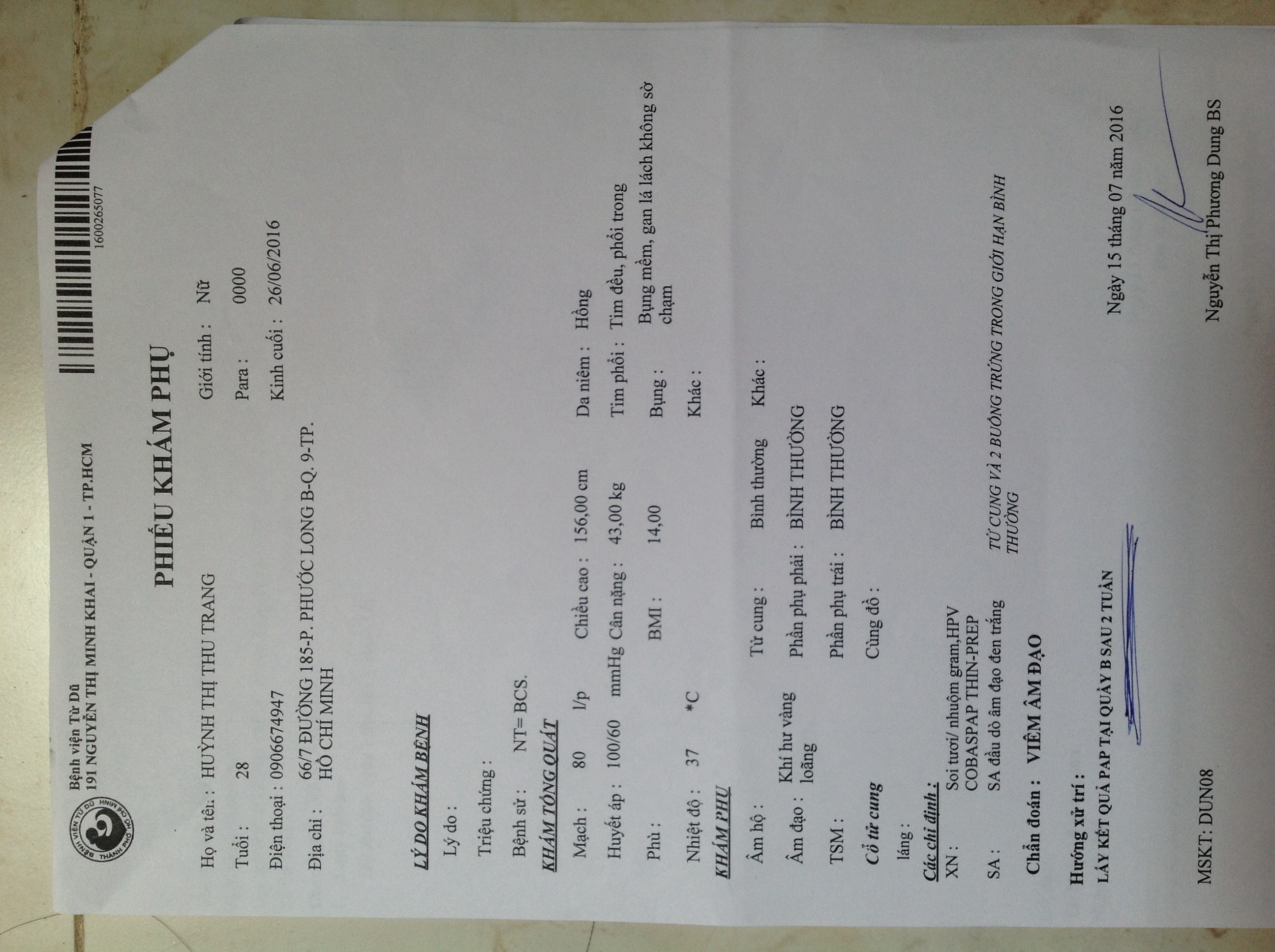 Chào bác sĩ, Em dự định đầu 2017 mang bầu nên muốn được tư vấn, thăm khám sức khỏe & dinh dưỡng để biết cơ thể có thiếu chất gì trước khi mang thai ở Từ Dũ thì khám ở đâu và khoa nào? Và vào ngày 15/07/2016 em đã đi khám phụ khoa và làm PAP Tại bệnh viện Từ Dũ. ---> kết quả khám phụ khoa thì em bị viêm âm đạo bác sĩ kê thuốc đặt 7 ngày và không cần tái khám, chỉ cần khám định kì 6 tháng/ lần thôi. Bác sĩ bảo em không kế hoạch thì sẽ có thai bình thường. ---> kết quả PAP thì các chị bảo 2 tuần sau nếu có kết quả bất thường thì bệnh viện nhắn tin, sau 2 tuần em không thấy kết quả nên yên tâm rồi quên lên bệnh biến lấy giấy kết quả luôn. Vậy không biết khi em đi khám tiền thai sản thì có cần đem giấy khám của theo không? Và có truy lại kết quả xét nghiệm cũ được không hay cần làm xét nghiệm lại? Em đính kèm giấy khám đợt rồi. Em cảm ơn