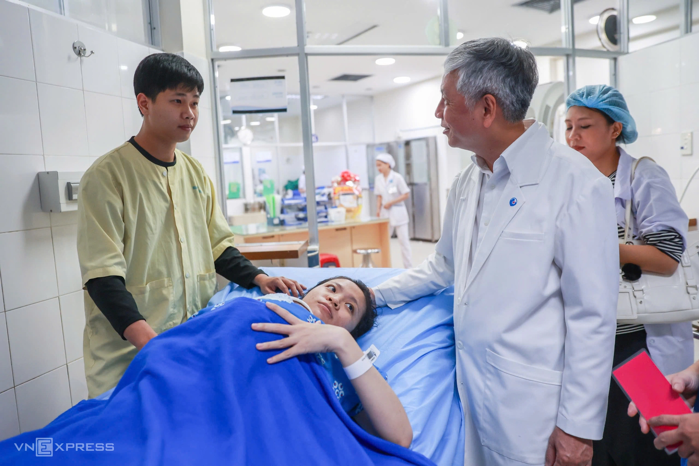 Trong khoảng 20 phút trước đó, êkíp liên tục động viên, điều chỉnh tư thế và hướng dẫn sản phụ giữ nhịp thở, tập trung rặn theo từng cơn co. Đứng cạnh vợ, anh Lê Thái Học nắm chặt tay, lau mồ hôi trên trán chị. Sau những nỗ lực của cả người mẹ và nhân viên y tế, em bé được bế ra, khiến hai vợ chồng vỡ oà, hạnh phúc.