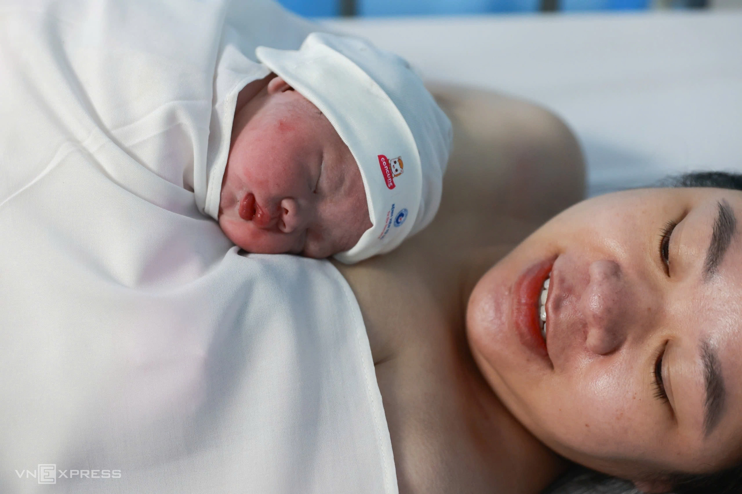 Đúng 0h00, bé gái nặng 3,3 kg của chị Trần Thị Kim Yến, 31 tuổi, quê Quảng Ngãi, cất tiếng khóc chào đời. Đây là con thứ ba của vợ chồng chị, nhưng là lần đầu anh Võ Văn Sơn, 34 tuổi, được vào phòng sinh, nắm tay và kề cận vợ suốt quá trình chuyển dạ.