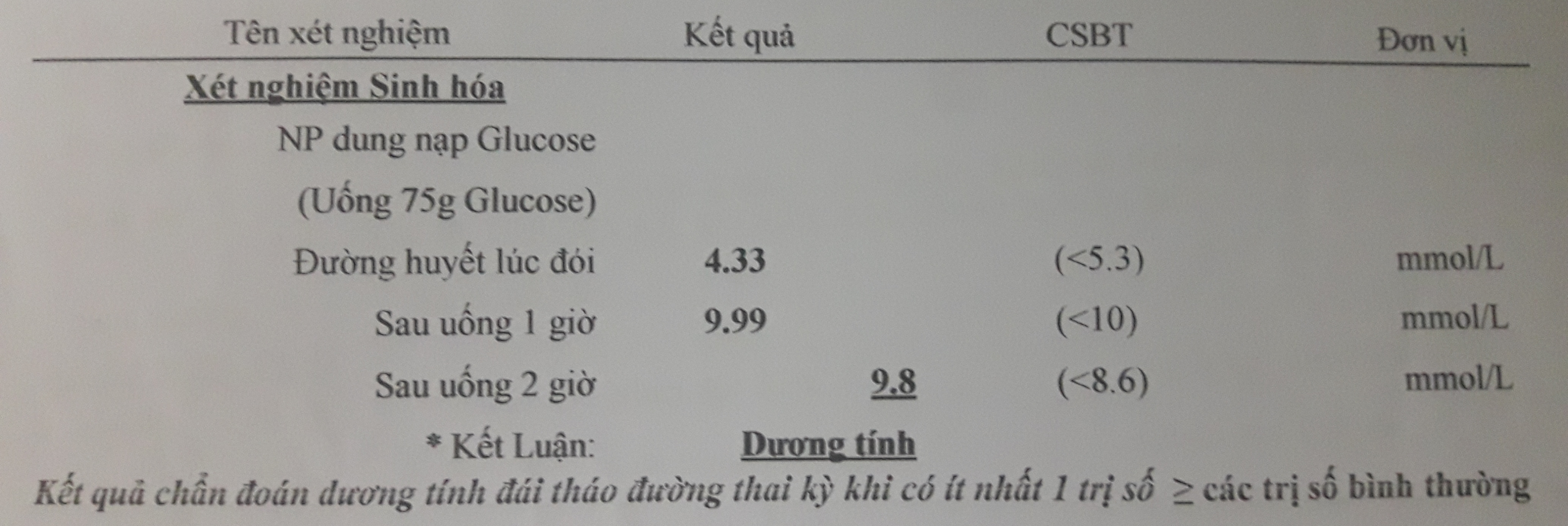 Chào Bác sĩ! Vợ tôi mang thai con thứ hai khoảng 26 - 27 tuần, 21/8/2018 vừa rồi có đi khám và test đường với kết quả như hình đính kèm. Mong quý Bác sĩ tư vấn giúp vợ chồng tôi về chế độ dinh dưỡng phù hợp. Trong thời gian chờ phản hồi từ quý Bác sĩ tôi xin chân thành cám ơn!