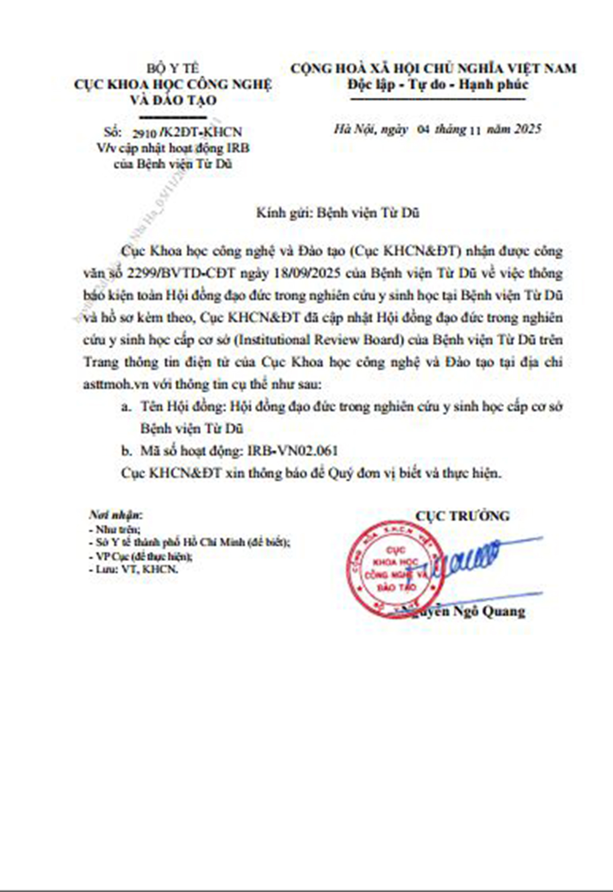 • Văn bản xác nhận: Công văn số 2910/K2ĐT-KHCN về việc cập nhật hoạt động IRB của Bệnh viện Từ Dũ, ban hành ngày 04 tháng 11 năm 2025.