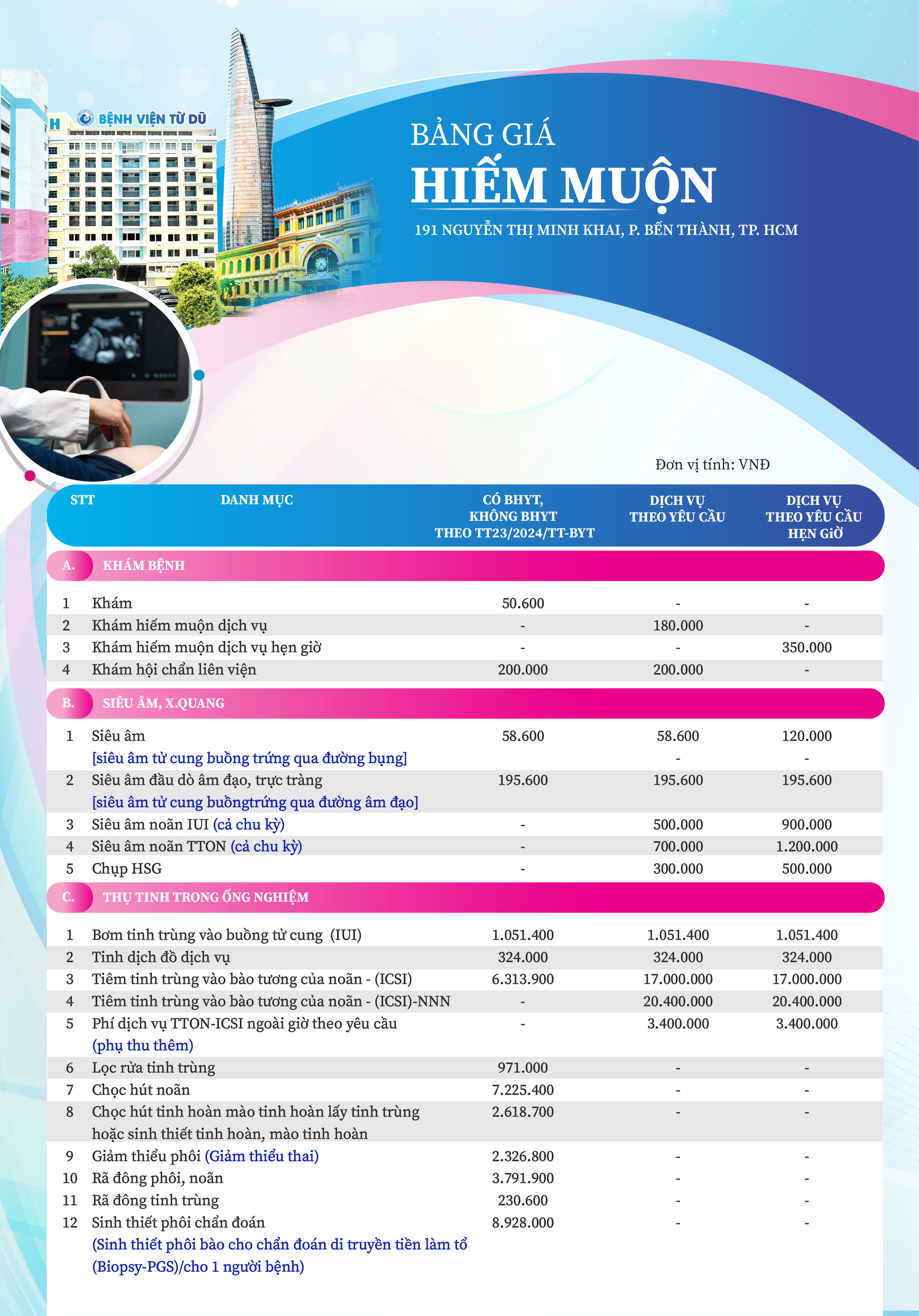 Bảng giá dịch vụ Kỹ thuật Hiếm muộn