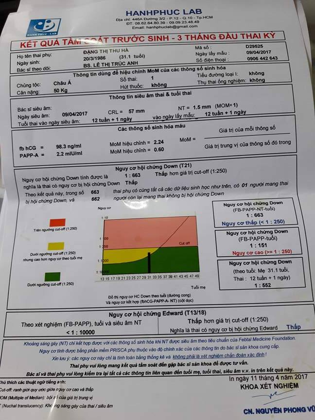Chào bác sĩ, Em năm nay 31 tuổi, đang mang thai con thứ 2 ở tuần 14, con đầu bình thường khỏe mạnh. Kết quả siêu âm vào 12W1N: CRL = 57 mm, độ mờ da gáy : 1,5mm (bình thường). và làm double test. ***Kết quả double test: ** Các thông số sinh hóa máu fb HCG 98.3ng/ml, Mom hiệu chỉnh: 2.24 PAPPA-A =2.2 mlU/ml, Mom hiệu chỉnh: 0.6 ** Nguy cơ hội chứng down: 1:663, thấp hơn giá trị cut-out (1:250), nghĩa là thai có nguy cơ bị hội chứng down thấp. Các chỉ tiêu cụ thể như sau: - Nguy cơ hội chứng down: (FB-PAPP-NT-tuổi): 1:663 (nguy cơ thấy <1:250) - Nguy cơ hội chứng down (FB-PAPP-tuổi): 1:151 (Nguy cơ cao >=250) - Nguy cơ hội chứng down: ( theo tuổi mẹ 31.1 tuổi) thai 12 tuần 1 ngày: 1:552 ** Nguy cơ hội chứng Edward: <1:1000 (thấp) Với kết quả này BS tại phòng khám ở địa phương khuyên em nên đến 16W xuống Từ Dũ chọc ối. Em đang rất hoang mang, lo lắng. Xin bác sĩ cho em lời khuyên ạ. Xin cảm ơn bác sĩ.