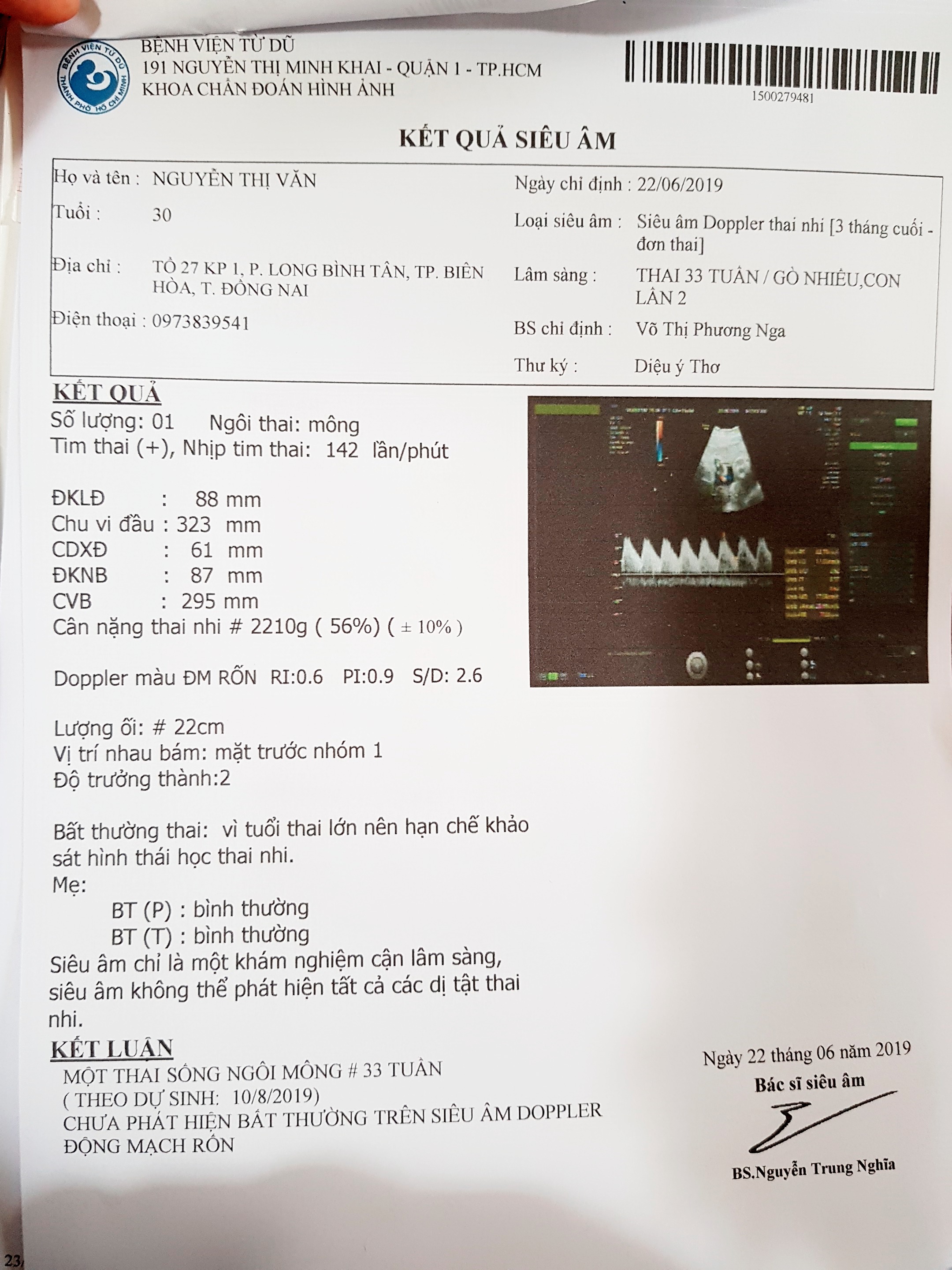 Thưa bệnh viện. Khi đi khám định kỳ ở tuần 33 tại BV Từ Dũ. Sau khi được cho đi siêu âm với kết quả: ===============================