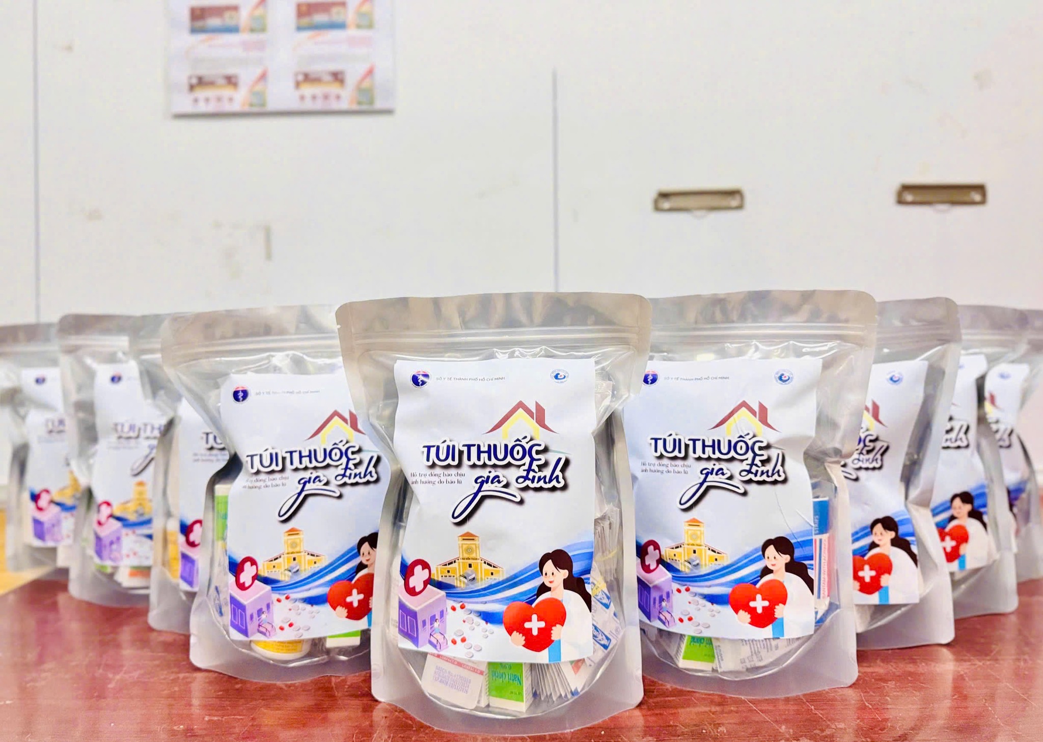 Mỗi túi thuốc gia đình có đầy đủ thuốc giảm đau, hạ sốt, dung dịch sát khuẩn, gạc, băng keo cá nhân và những loại thuốc điều trị các bệnh thường gặp do bão lũ như tiêu chảy, sốt, nhiễm trùng, dị ứng…