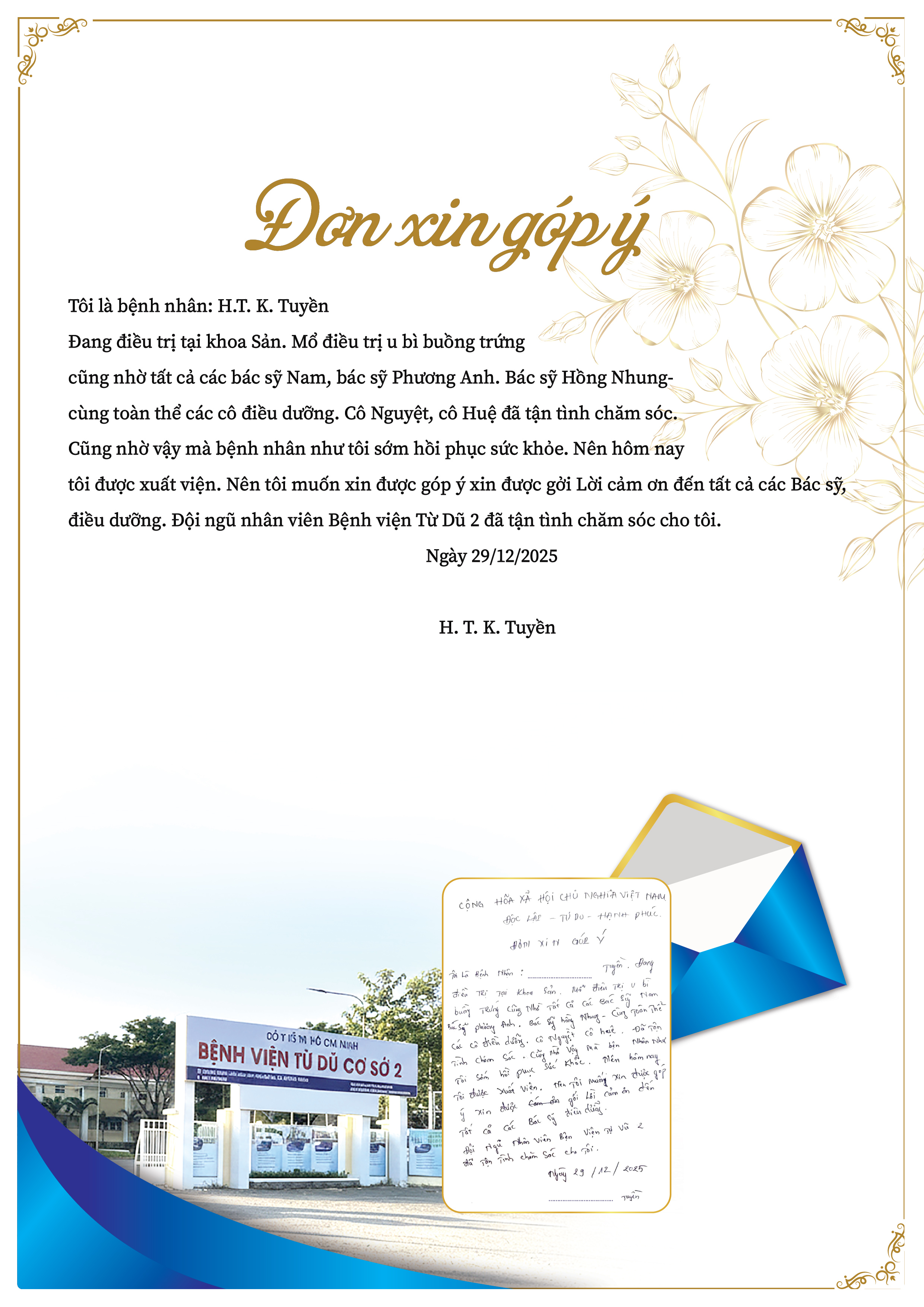 Cũng nhờ vậy mà bệnh nhân như tôi sớm hồi phục sức khỏe. Nên hôm nay tôi được xuất viện. Nên tôi muốn xin được góp ý xin được gởi Lời cảm ơn đến tất cả các Bác sỹ, điều dưỡng. Đội ngũ nhân viên Bệnh viện Từ Dũ 2 đã tận tình chăm sóc cho tôi.