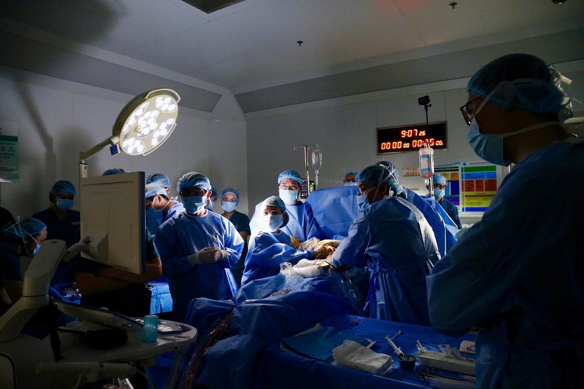Ê-kíp bác sĩ Bệnh viện Từ Dũ và Bệnh viện Nhi Đồng 1 thực hiện ca can thiệp thông tim bào thai cho thai nhi mắc dị tật tim bẩm sinh nặng (Ảnh: BV)