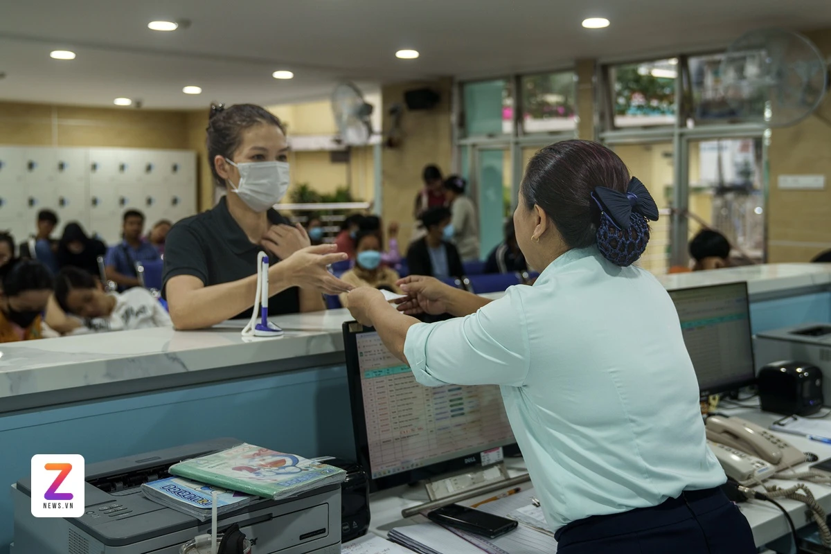 Tại quầy tiếp nhận bệnh nhân, nhân viên y tế đang hướng dẫn người dân hoàn tất thủ tục nhập viện.Hệ thống quản lý dữ liệu điện tử hỗ trợ tra cứu thông tin, giảm thiểu sai sót trong quá trình tiếp nhận. Khu vực chờ được bố trí ghế ngồi và quạt thông gió, tạo sự thoải mái cho người nhà bệnh nhân.