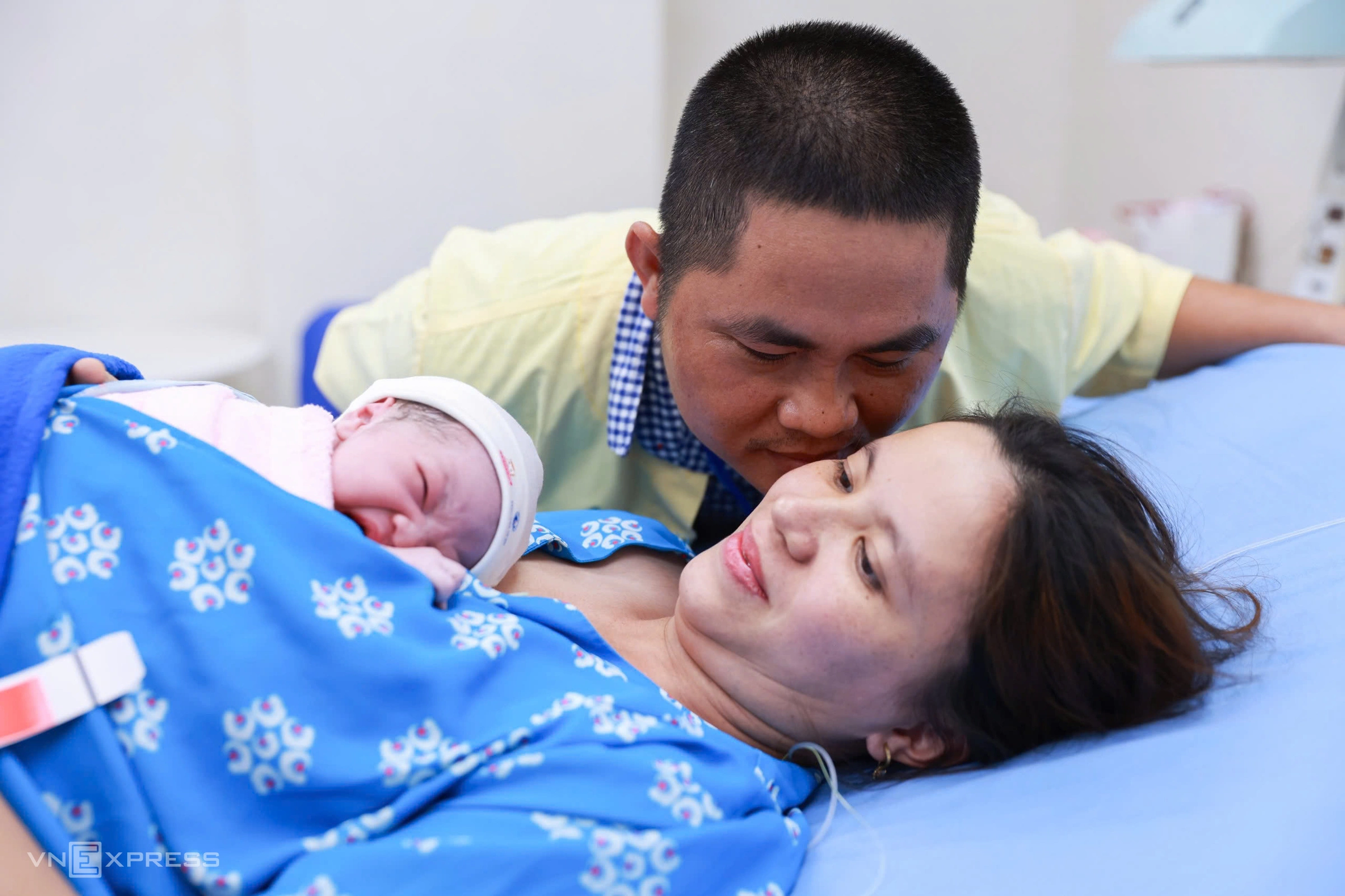 Đúng 0h00, bé gái nặng 3,3 kg của chị Trần Thị Kim Yến, 31 tuổi, quê Quảng Ngãi, cất tiếng khóc chào đời. Đây là con thứ ba của vợ chồng chị, nhưng là lần đầu anh Võ Văn Sơn, 34 tuổi, được vào phòng sinh, nắm tay và kề cận vợ suốt quá trình chuyển dạ.