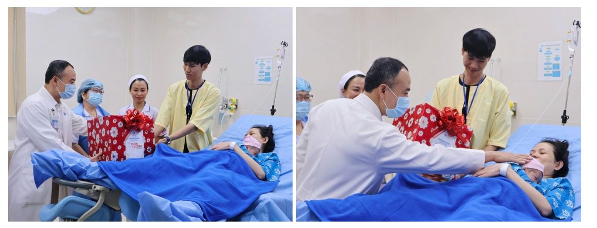Bác sĩ Bảo Anh, Phó giám đốc Bệnh viện Từ Dũ tặng quà, gửi lời chúc mừng đến gia đình sản phụ. ẢNH: HOÀI NHIÊN